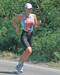 I think I had the quickest transition of my life and was headed out on the run course, now ahead of Janine. The run was an out-and-back up to the airport. Yup, Hurricane Hill again. I knew Janine was right behind me, so I pushed hard. She had the advantage being the “hunter” and I the “hunted”. I just kept going and never looked back because I didn’t want to see how close she was. At the turnaround, I saw I had put some distance between us, but not enough to relax so I just kept going strong. Along the way I saw Nikki, Sarah, Danielle, Paula, and Wendy and we all had a friendly “hello” for each other. I was able to hold off Janine for first, but wow, was it a tough race.